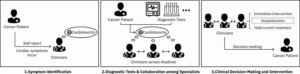 Fig. 1. Current Workflow of Cardiotoxicity Diagnosis. Initially, clinicians identify symptoms or suspect cardiotoxicity based on patient self-reports or acute cardiac symptoms. Diagnostic tests are then performed, and collaboration with other specialists takes place to confirm diagnosis. Subsequently, clinical decisions concerning immediate interventions, treatment modifications, and ongoing monitoring are made.