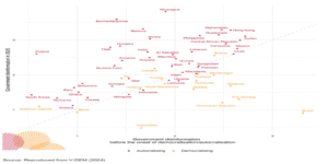 Figure 1 demonstrates the connection between autocratisation and the spread of government-led disinformation. The vertical axis shows domestic disinformation levels disseminated by governments, while the horizontal axis reflects disinformation scores measured prior to the beginning of democratisation or autocratisation episodes (which vary by country and year). Only nations that underwent regime changes are displayed, labeled as “autocratising” or “democratising” in 2023. Although descriptive in nature, the figure indicates that states experiencing autocratisation tend to exhibit higher levels of state-driven disinformation.